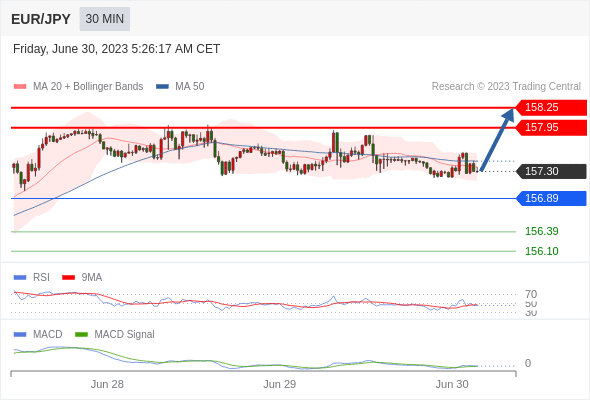 欧元/日元 当日内: 有上涨的可能,目标价位定在 158.25 。