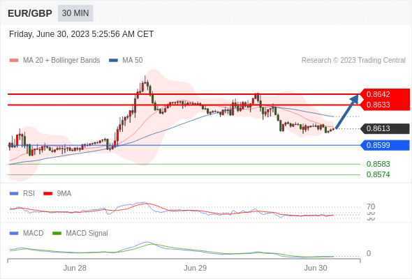 RSI技术指标小于中性区域50。 MACD技术指标呈现看跌状态并 处在其信号线的上方。 此外,价位处在其20天及50天移动平均线下方 ( 当前是 0.8615 和 0.8623 )。