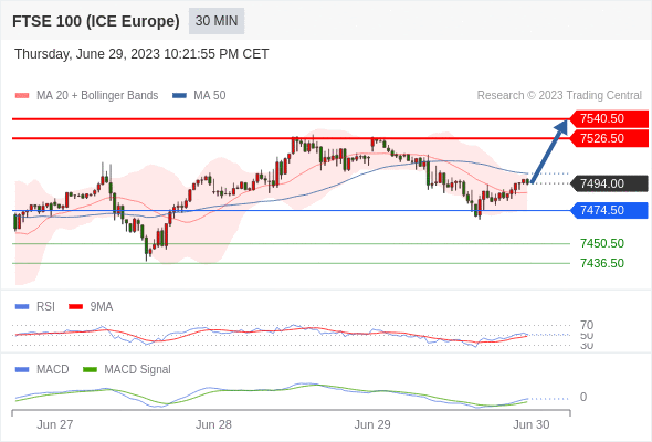 RSI技术指标大于中性区域50。 MACD技术指标处在其信号线之上 看空。 另外,价位在其50个时期移动平均线以下 ( 7501.17 ) 但高于20个时期移动平均线 ( 7487.45 )。