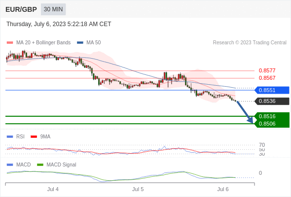 欧元/英镑 当日内: 看跌,在 0.8551 之下。
