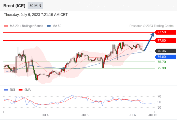 在 76.00 之上,看涨,目标价位为 77.00 ,然后为 77.50 。