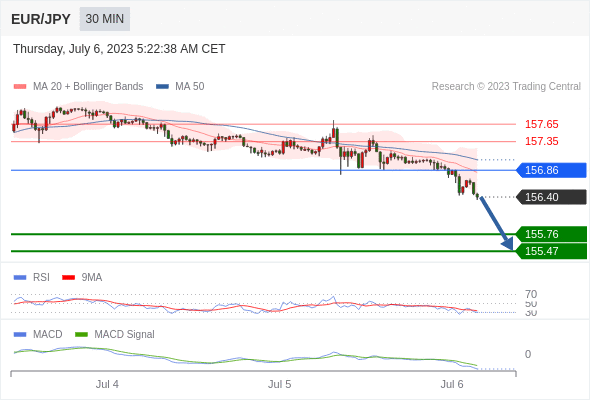 欧元/日元 当日内: 看跌,在 156.86 之下。