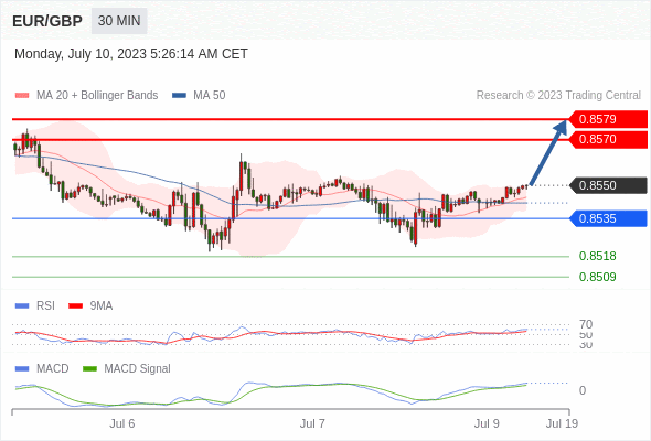 欧元/英镑 当日内: 看涨,当 0.8535 为支撑位。