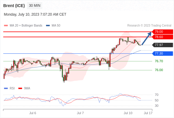 在 77.30 之上,看涨,目标价位为 78.60 ,然后为 79.00 。