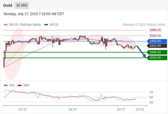 在 1958.00 之下,看跌,目标价位为 1948.00 ,然后为 1943.00 。