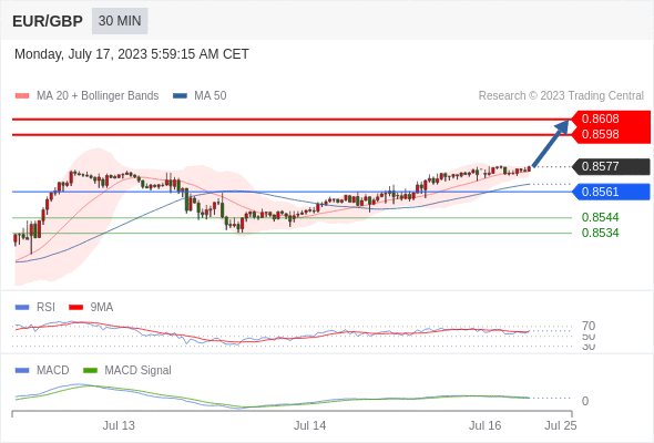 RSI技术指标超过50。 MACD技术指标呈现看多状态并 处在其信号线的下方。 此外,价位高于其20天及50天移动平均线 ( 分别位于 0.8574 和 0.8566 )。