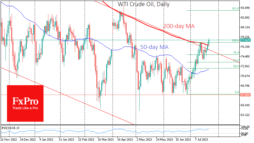 FxPro高级分析师Alex Kuptsikevich指出:上周末,WTI原油突破了此前的本地高点,并攀升至下行通道阻力位上方,标志着油价过去12个月所遵循的趋势出现了突破。周一,涨势继续,我们注意到突破了自2022年8月以来一直作为阻力位的200日移动均线。