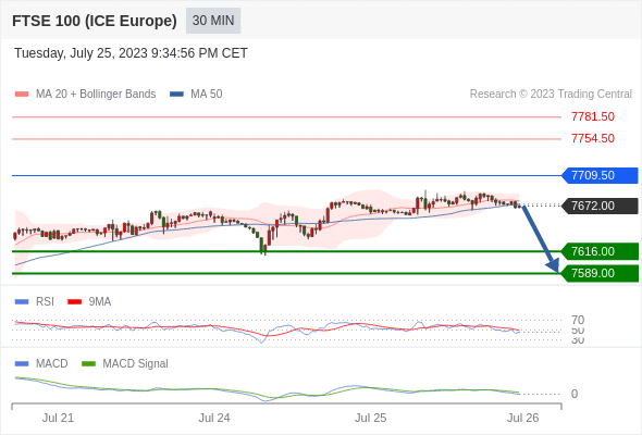 英国富时100指数期货 当日内: 看跌,当 7709.50 为阻力位。