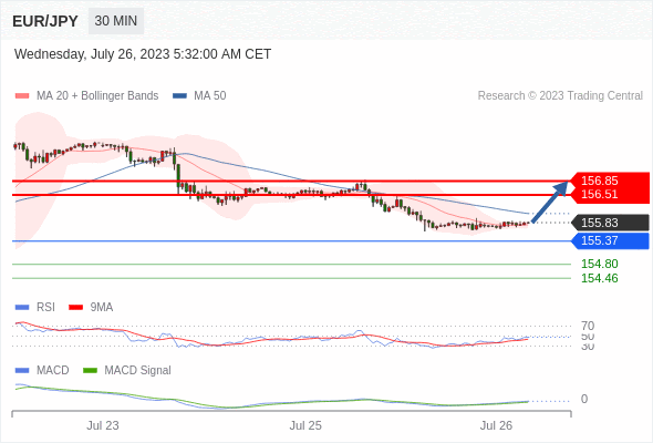 欧元/日元 当日内: 有上涨的可能,目标价位定在 156.85 。
