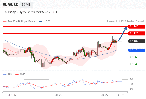 在 1.1075 之上,看涨,目标价位为 1.1125 ,然后为 1.1145 。