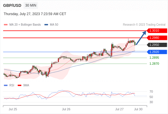 在 1.2920 之上,看涨,目标价位为 1.2980 ,然后为 1.3010 。