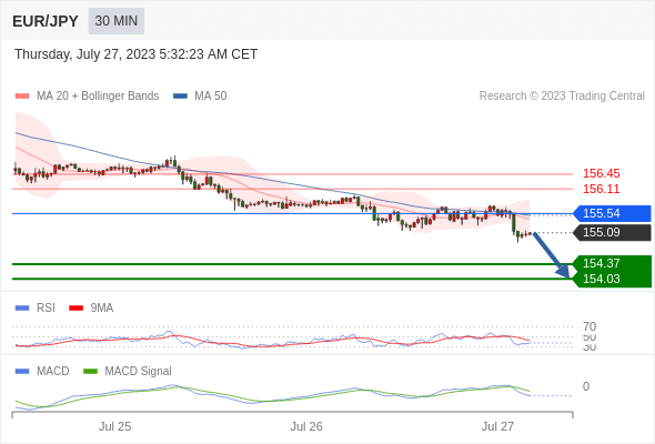 欧元/日元 当日内: 看跌,在 155.54 之下。