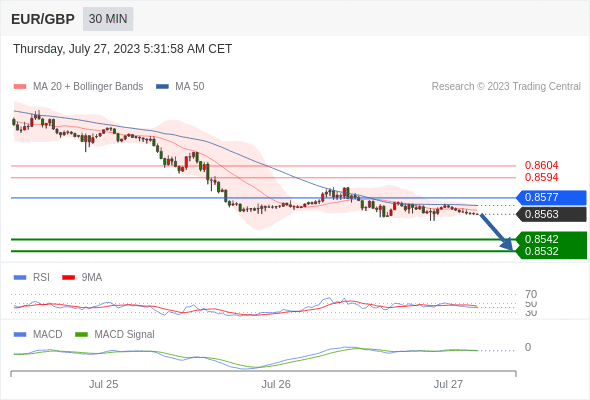 欧元/英镑 当日内: 看跌,在 0.8577 之下。