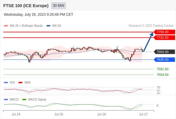 如跌破 7626.50 ,英国富时100指数期货 目标方向定在 7581.50 和 7554.50 。