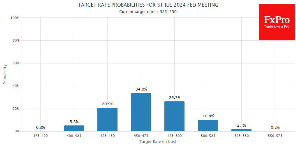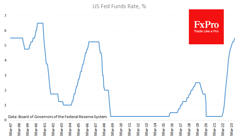FxPro高级分析师Alex Kuptsikevich指出:市场将此视为利率见顶,并预期货币政策将很快出现逆转。利率期货价格反映出,美国联邦基金利率最早将于明年1月开始下降,并表明一年后联邦基金利率将比当前水平低75个基点,到2024年底将降至125个基点。
