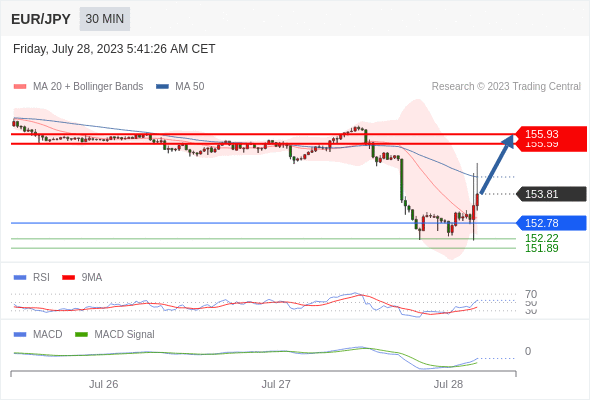 欧元/日元 当日内: 看涨。