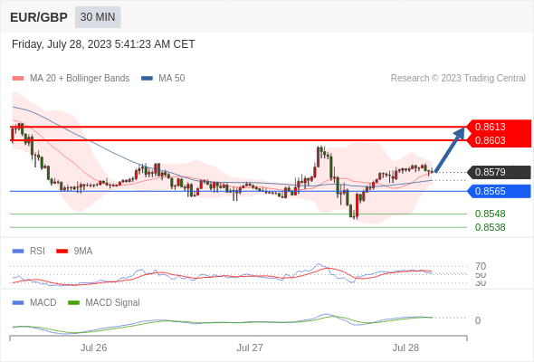 欧元/英镑 当日内: 看涨,当 0.8565 为支撑位,目标定在0.8613。