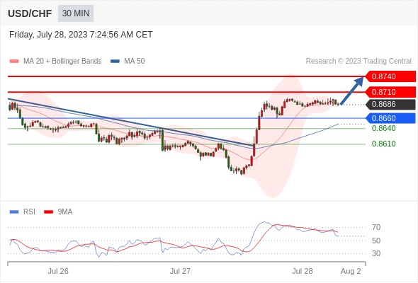 在 0.8660 之上,看涨,目标价位为 0.8710 ,然后为 0.8740 。
