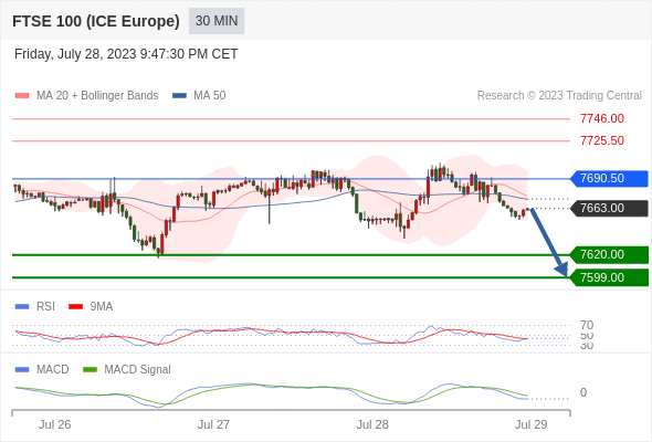 英国富时100指数期货 当日内: 看跌,在 7690.50 之下。