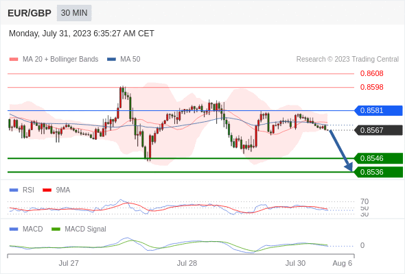欧元/英镑 当日内: 看跌,在 0.8581 之下。