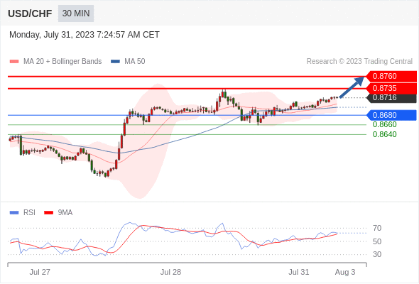 在 0.8680 之上,看涨,目标价位为 0.8735 ,然后为 0.8760 。