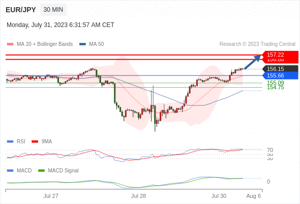 欧元/日元 当日内: 看涨,当 155.66 为支撑位。
