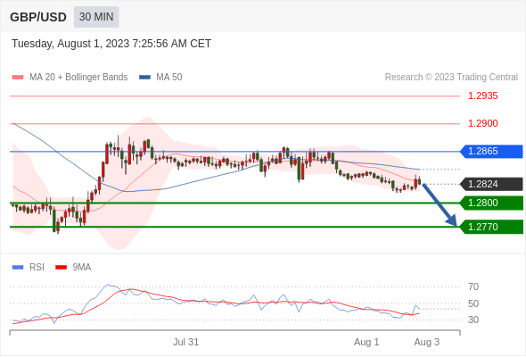 在 1.2865 之下,看跌,目标价位为 1.2800 ,然后为 1.2770 。