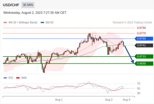 在 0.8760 之下,看跌,目标价位为 0.8710 ,然后为 0.8690 。