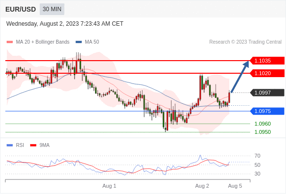 在 1.0975 之上,看涨,目标价位为 1.1020 ,然后为 1.1035 。