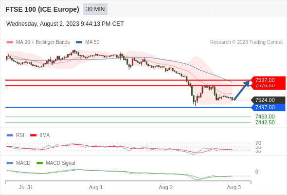 RSI技术指标低于50。 MACD技术指标处在其信号线之上 看空。 此外,价位低于其20个时期及50个时期移动平均线 ( 分别位于 7547.90 和 7589.16 )。