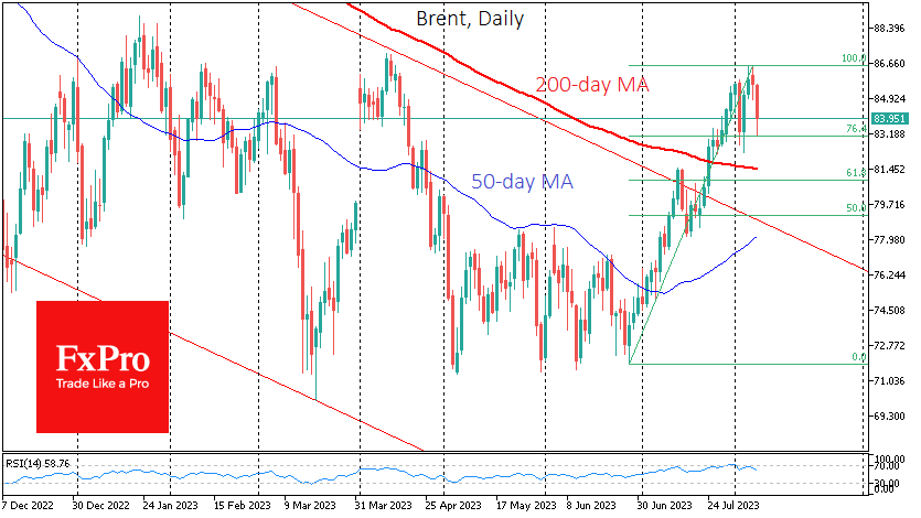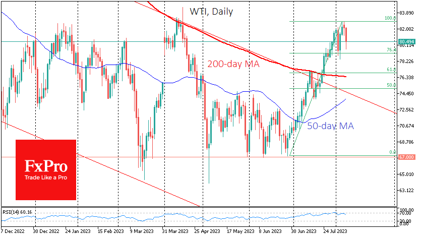 从技术分析的角度来看,原油价格有些过热,至少会出现修正性回调。本周早些时候,西德克萨斯中质原油(WTI)价格从6月底接近67美元的低点反弹至82.9美元,涨幅超过20%。在这种环境下,全面回调意味着金价将跌至76.5至77美元,200日平均线为下限,反弹幅度的61.8%为上限。