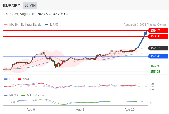 欧元/日元 当日内: 看涨,当 157.28 为支撑位。