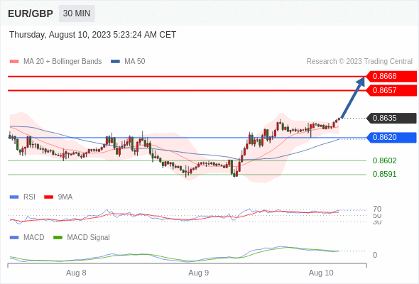 看涨,当 0.8620 为支撑位,目标定在0.8668。