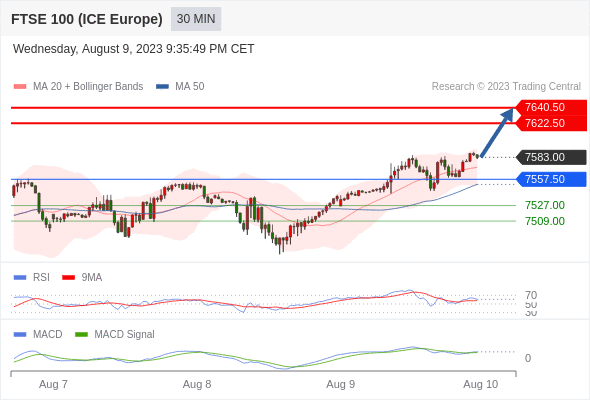 RSI技术指标大于中性区域50。 MACD技术指标处在其信号线之上 看多。 此外,价位处在其20个时期及50个时期移动平均线上方 ( 当前是 7571.28 和 7551.62 )。