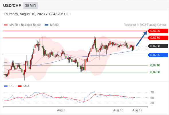 在 0.8755 之上,看涨,目标价位为 0.8780 ,然后为 0.8790 。