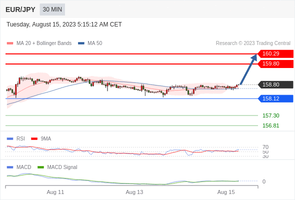 RSI技术指标超过50。 MACD技术指标呈现看多状态并 处在其信号线的上方。 此外,价位处在其20天及50天移动平均线上方 ( 当前是 158.69 和 158.61 )。 最后,股价目前处在布林线通道上轨上方 (位于 158.79)。