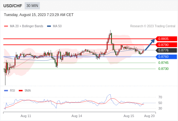 在 0.8760 之上,看涨,目标价位为 0.8790 ,然后为 0.8805 。