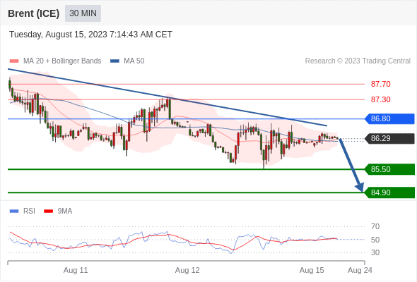 布伦特原油 (ICE)? (V3)? 当日内: 短期关键阻力位在86.80。