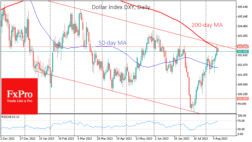 FxPro高级分析师Alex Kuptsikevich指出:美元指数目前接近103,这里集中了7月本地高点、200天移动均线以及去年11月以来的看跌区域上限。