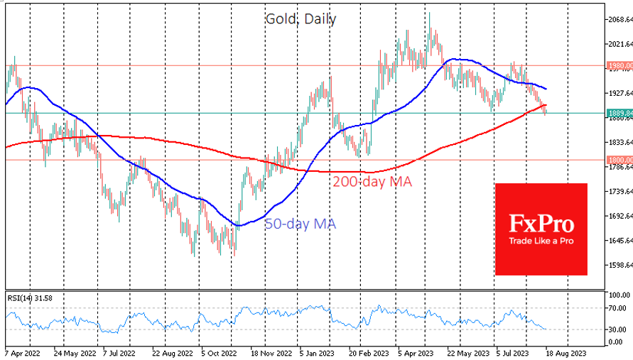 在8月的下跌中,黄金首次跌破了50日移动平均线,两天前,它跌破了200日移动平均线。这两条曲线都是中长期趋势指标。黄金在跌破50日移动均线后未能反弹,但这只会加剧抛售。