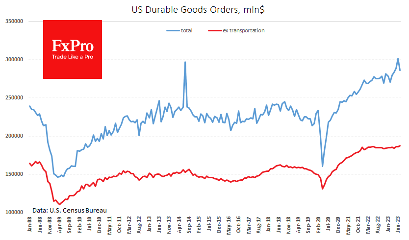 另一份报告耐用品订单情况并不乐观。总订单下降5.2%,几乎抹去了前两个月的涨幅(+4.4%和2.0%)。不包括运输的订单增加了该指标的波动性,上升了0.5%。新订单数量也高于去年年中创下的历史最高水平。尽管后一项指标高于分析师的平均预测,但它表明经济增长并不活跃。