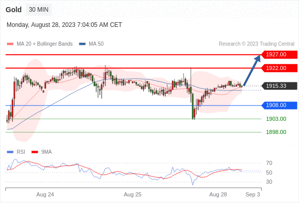 在 1908.00 之上,看涨,目标价位为 1922.00 ,然后为 1927.00 。