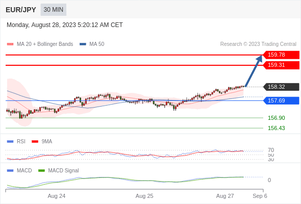 欧元/日元 当日内: 看涨,当 157.69 为支撑位。