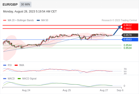 欧元/英镑 当日内: 看涨,当 0.8563 为支撑位,目标定在0.8612。