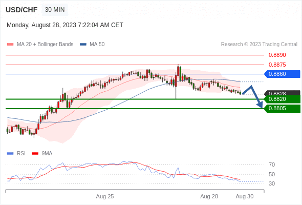 在 0.8860 之下,看跌,目标价位为 0.8820 ,然后为 0.8805 。