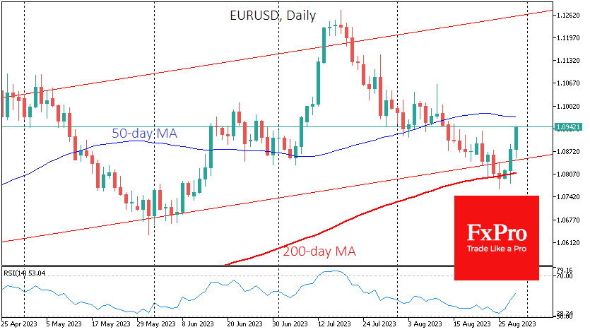 FxPro资深市场分析师Alex Kuptsikevich指出,这对欧元来说是个好消息。受此消息影响,欧元兑美元在不到24小时内上涨超过1.5%至1.0940,凸显了美国通胀压力的降温与欧元区的利好消息。