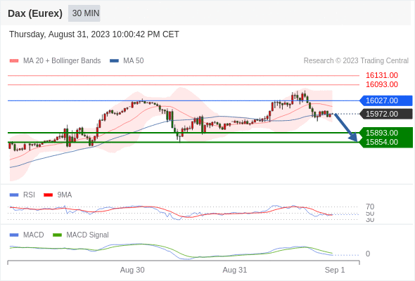 德国DAX指数期货 (Eurex)? 当日内: 当 16027.00 维持阻力位时,看跌,目标锁定在 15854.00 。