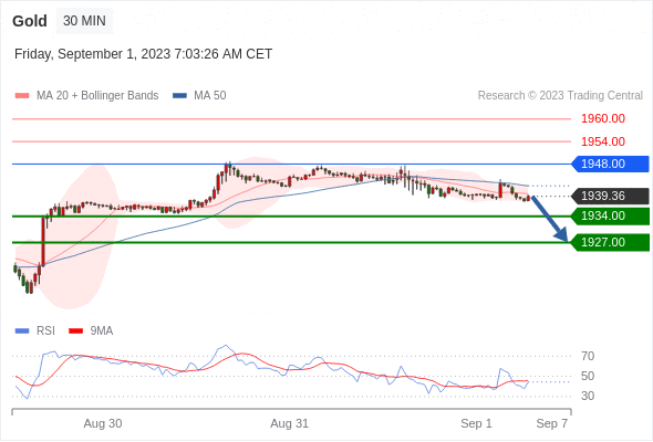在 1948.00 之下,看跌,目标价位为 1934.00 ,然后为 1927.00 。