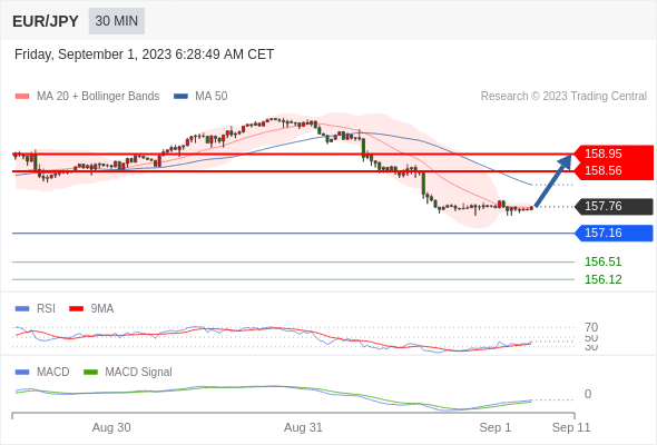 欧元/日元 当日内: 有上涨的可能,目标价位定在 158.95 。