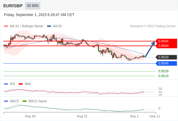 欧元/英镑 当日内: 有上涨的可能,目标价位定在 0.8594 。